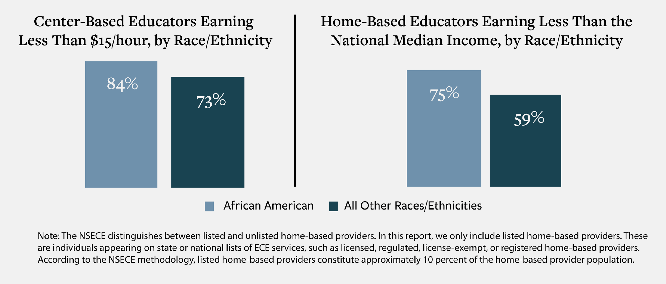 Today, those working in programs regulated and funded as child care versus education continue to face the greatest penalties in compensation, working conditions, and opportunity to advance their skills. These penalties fall most heavily on Black educators and others from historically under-resourced communities who are more likely to be classified as child care workers providing services in the private market.